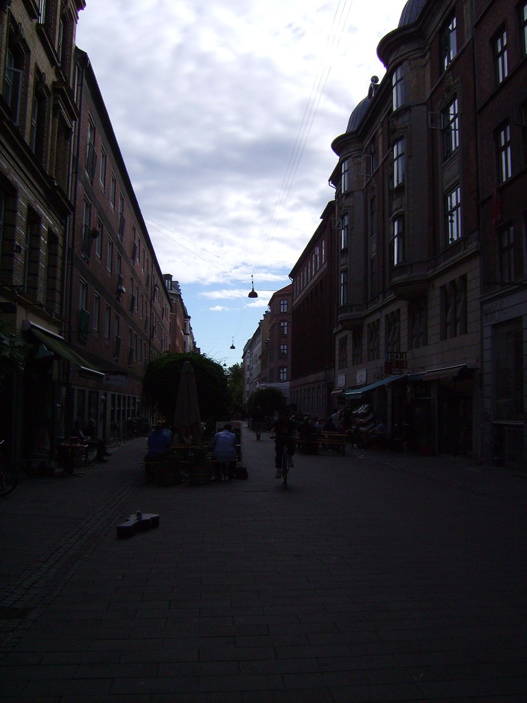 I returned to what looked to be the most promising location at Blågårdsgade in Nørrebro (7.25.10). Just before I started, Charles emerged from the facing Har Bo café, and that gave me just the right spurt of energy to begin. I sang pretty well but only lasted about forty five minutes before I had to call it quits. My throat wasn’t improving but I’d gone out because I needed the money. The passersby where mostly younger folk of all sorts of different ethnicities, so I started with nineties tunes. The greengrocers across the way gave me big thumbs up and wide smiles. A young man in yellow plaid tipped me with a thank you for Yellow. A beaming brunette bent down to tip for High & Dry. All sorts of passersby found Torn hilarious.