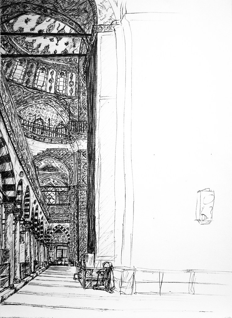I walked somewhere around twenty kilometers, all quite miserable. Anuradha told me, earlier, not to spare the lows from my recountings if its for my readership – but now that I’m writing this I realize it’s also for me. I don’t want to go back to that frustration and despair. So I’ll just detail the facts. While Turkey seemed to have cooled into an instant fall on the first of September, the temperature rose once again this day, cresting well above thirty degrees with little breeze. Renovation energy reigned in full force: Süleymaniye Cami and the Fatih Complex all but closed off, with scaffoldings inside and out and plasterboard completely obscuring the roofs and walls, the tombs nearby closed as well. A few positives dotted in between – the gorgeous Valens Aqueduct in the valley between these two mosques, stopping in Şehzade Cami just long enough to draw the mihrab, marveling at the almost modern simplicity of the square based Sultan Selim Cami.