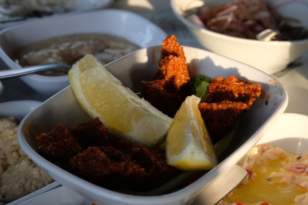 QQ chose a restaurant to eat at before heading to the turtle beach based on the fact that it had high ratings with only Turkish reviews. What a feast! With no proper communication we just ordered the mezze set with fish, agreeing to pay the penciled in price (likely due to the rather insane inflation of the Turkish lira of late). As one of our seventeen mezze was a sizzling plate of prawns, we figured that that was was fish portion of the meal that I’d asked for, as I’d asked to replace “et” with “balik”. And we ate all of the mezze. And then out came two entire grilled fishes, one each, accompanied with salad. At this point the cats were becoming rather obnoxious for me (QQ could not have been happier) and it was only with their help that we were able to finish our fish. QQ delightedly redirected them from bothering me by feeding them by hand, while I resorted to throwing little chunks out the window so they’d leave me alone when QQ left me to fend for myself with a bathroom visit.
